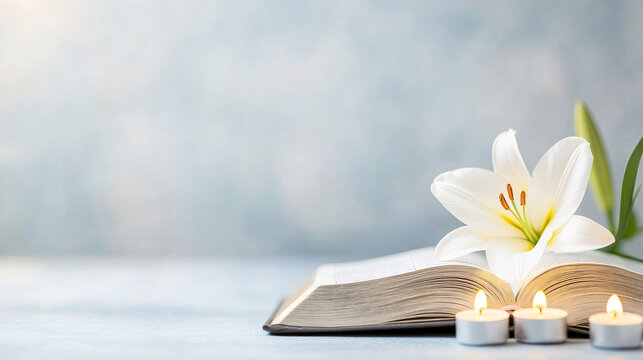 Open book surrounded by a white lily and glowing candles captures spirituality, purity, hope, and remembrance, setting a tranquil mood