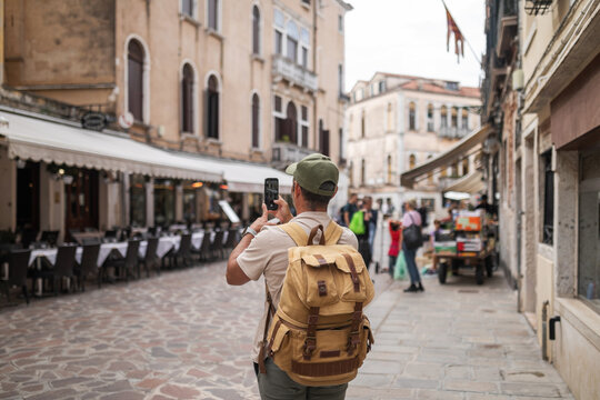 Tourist taking a photo with his phone at a restaurant on a street