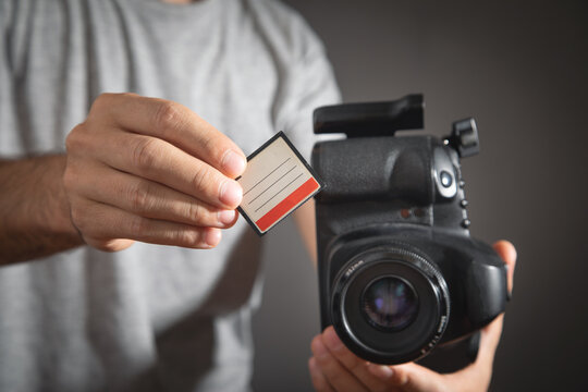 Photographer holding memory card insert DSLR camera.