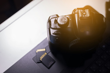 Photographer's hand holding memory card for preparing plug-in to computer.