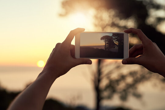 Person, hands and phone for picture in nature at sunset, vacation with memory of horizon. Mobile photographer, ui screen and summer scene with tree at dusk, beach holiday with creativity in Mauritius