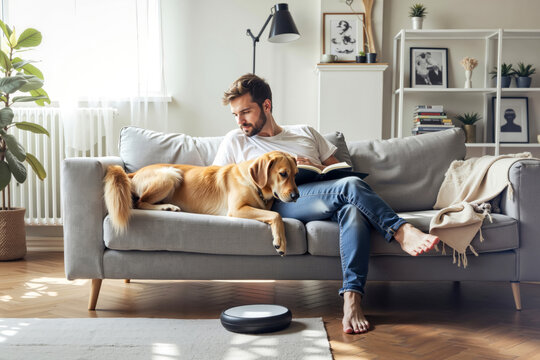 A man sitting on a couch with his dog and reading a book