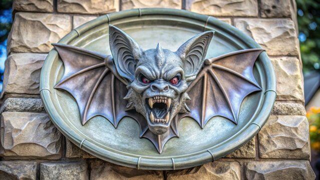 Decorative bat sculpture with menacing expression on stone wall