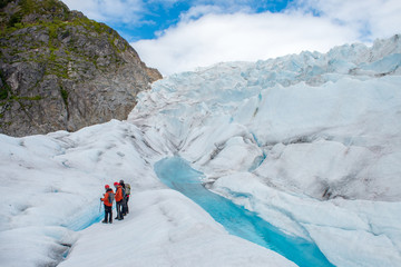 Hikers standing near colorful blue meltwater on a glacier in Alaska