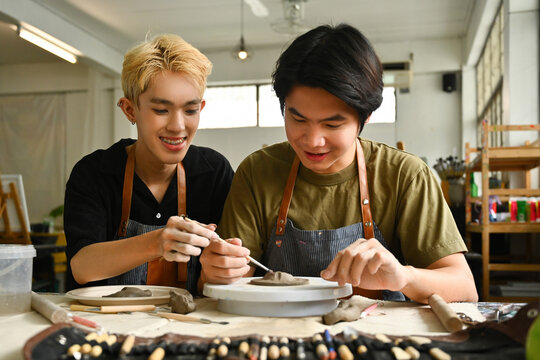Male pottery instructor teaching female student in studio using laptop. Woman shaping clay with guidance. Creative learning and artistic skills development.