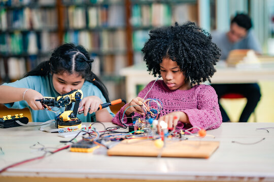 Two young learners concentrate in robotics task completion, engaging STEM project, electronic experimentation, teamwork development, confidence growth, modern classroom learning experience.