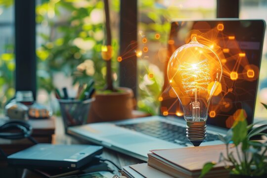 Collaborating on laptop with holographic interface in modern open office mentoring scene