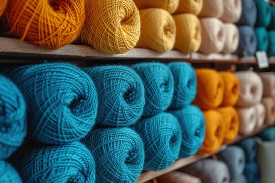 Colorful Array of Yarn Skeins Organized Neatly on Wooden Shelves