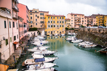 A canal so called "fossi with moored boats in the Venezia Nuova, Livorno, Italy