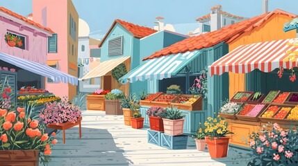 Colorful outdoor market stalls display fresh produce and vibrant flowers under awnings