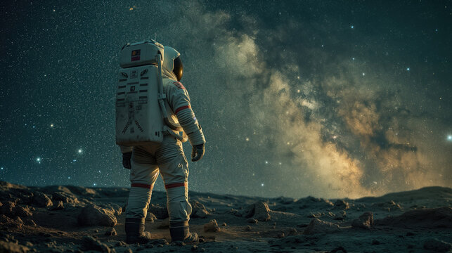 On the lunar terrain, astronauts  the background of the vast sky full of stars and the Milky Way.