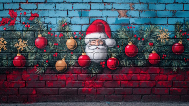 A mural of Santa Claus surrounded by pine branches, red and gold ornaments, and berries on a red and blue brick wall, creating a joyful and festive street art scene for the holidays
