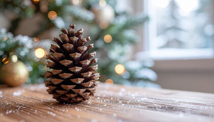 Cozy winter scene with a prominent pinecone dusted in snow sits on a rustic wooden table, softly illuminated by warm bokeh lights from a festive Christmas tree.