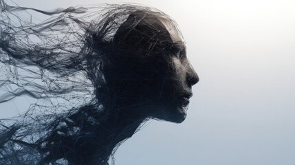Graceful woman's face with hair flowing in the wind capturing the essence of emotion mesh current and emotional connection