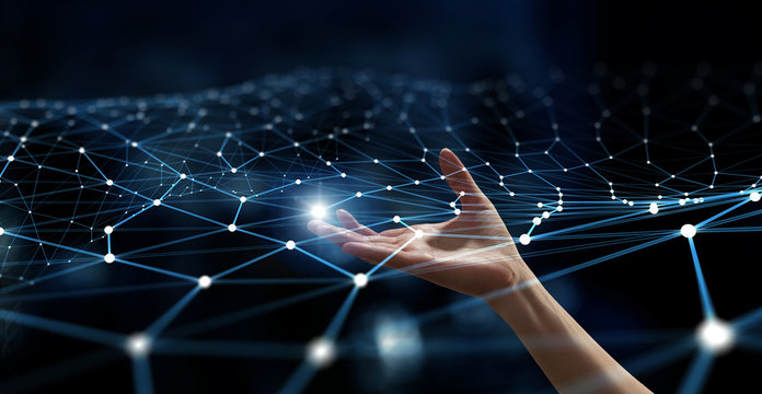 A human hand reaching out to touch a point within a complex network of connections, symbolizing interaction and technological reach
