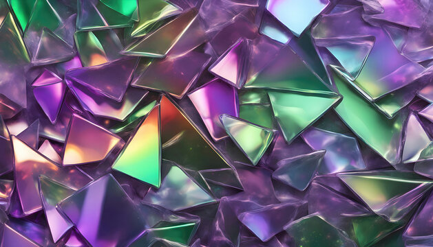 Holographic background with glass shards. Rainbow reflexes in green and purple.