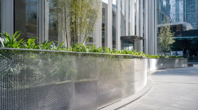 Silver mesh curved screen wall in front of a minimalist building under clear afternoon sun with accurate shadow