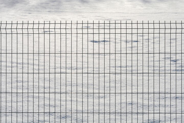 A minimalist view of a black metal wire mesh fence standing in front of a flat field covered with a layer of fresh white snow