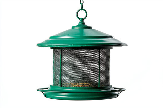 hanging metal mesh bird feeder in green, isolated on white background, perfect for clinging birds like woodpeckers and chickadees, squirrel-resistant construction