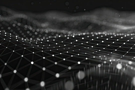 Futuristic abstract digital network landscape with interconnected nodes and lines in monochrome. Technology, connectivity, and data structure concept