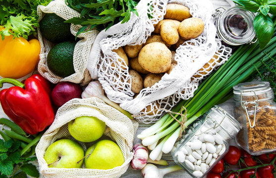 Colorful fresh fruits and vegetables in reusable cotton bags on blue background. Zero waste or responsible food shopping and storage concept. Sustainable lifestyle