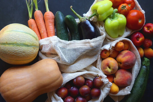 Reusable mesh bags for fruits and vegetables, filled with various healthy food. Dark background, top view.