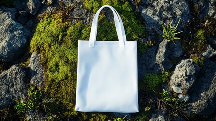 Natural and reusable cotton eco bag on green background top view. Zero waste and eco friendly concept for sustainable organic lifestyle. Flat lay.