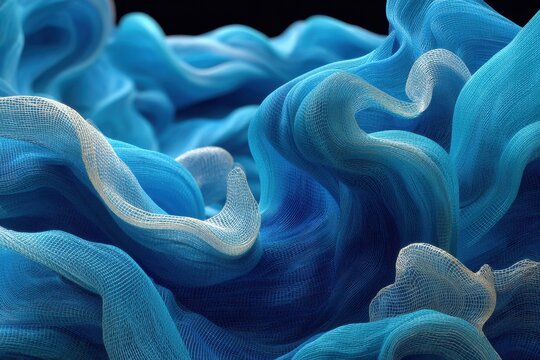 Abstract blue silk waves with intricate mesh texture in flowing fabric design