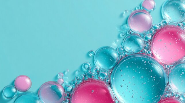 Vibrant macro photography of iridescent liquid bubbles in mesmerizing turquoise and pink hues, creating an abstract and ethereal visual composition of organic shapes and textures