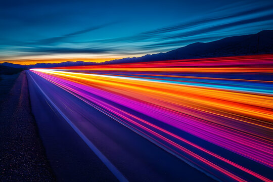 Vibrant neon light trails streak across the dark sky, creating a mesmerizing display as dusk settles over the deserted roadway