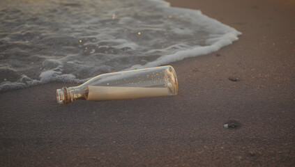 Message in a bottle washed ashore on sandy beach