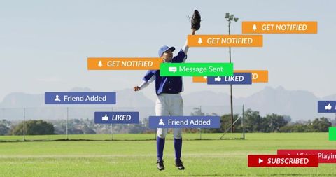 Baseball outfielder jumping to catch ball with social media notifications overlay