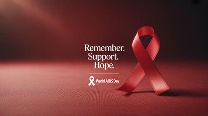 Red ribbon symbol for World AIDS Day with message of remember, support, hope