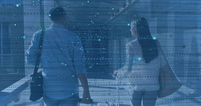 Colleagues shaking hands with futuristic augmented reality overlay
