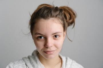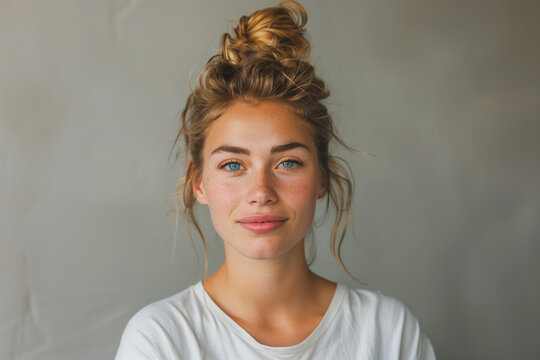 Natural Beauty with a Playful Twist. A radiant woman with blue eyes and a messy bun radiates natural beauty and a carefree spirit, her freckled cheeks adding charm against a soft grey backdrop.
