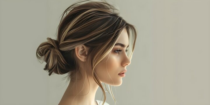 Messy dreamy low bun hairstyle for woman. Female hairstyle free bun, copy space.