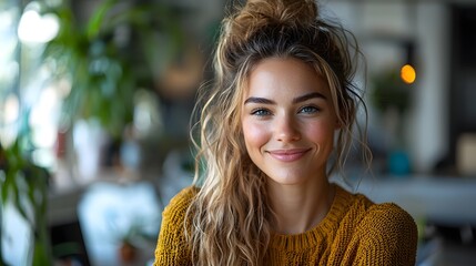 A beautiful young woman with curly blonde hair smiles warmly wearing a yellow sweater indoors with plants in the background
