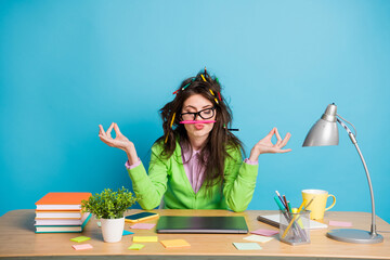Portrait of peaceful girl sit table meditate have messy pencil hairstyle isolated over blue color background