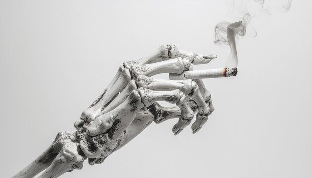 A skeleton hand holds a lit cigarette with smoke rising against a white background, symbolizing mortality and the dangers of smoking.