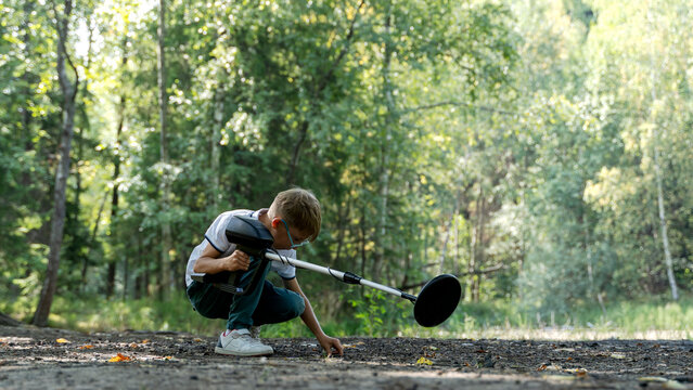 serious boy with a metal detector examines the soil on a rocky trail on a summer evening