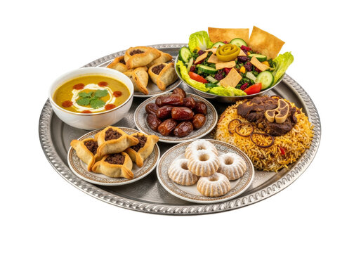 indian festive platter with biryani curry samosa platter and desserts on a metal tray