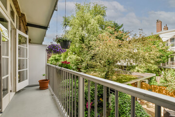A modern balcony with plants and black railing. This image is perfect for showcasing contemporary architecture and urban living.