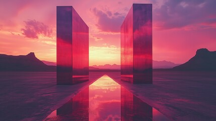 Red Metal Glass Columns Reflecting Pink Sky in Sahara Desert, Surreal Mirror Water Landscape with Path to Mountains