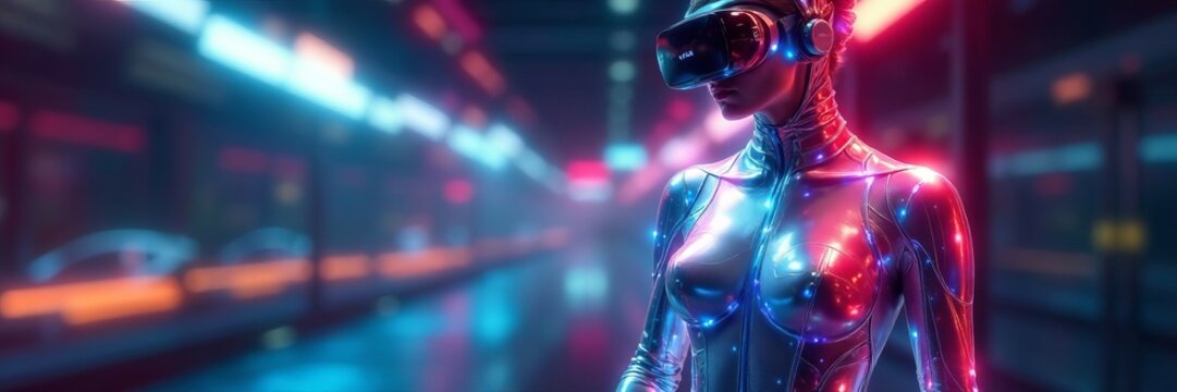 Futuristic woman in metallic bodysuit with neon glow