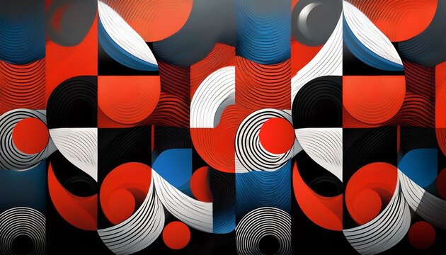 intricate geometric design featuring textured circles and semi circles in red orange blue white and black metallic borders enhance depth abstract trend background