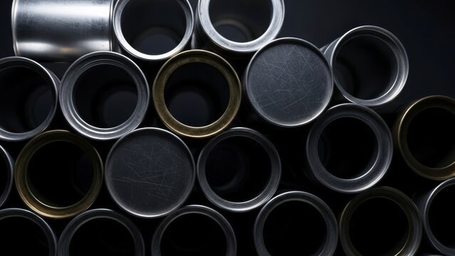 Top-down view of numerous empty metal cans arranged in a dense, abstract pattern, highlighting their circular openings and metallic sheen against a dark background.