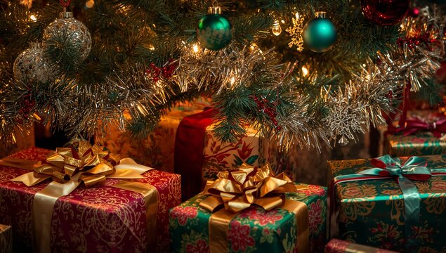 Showcasing wrapped gift boxes sitting under evergreen tree at home corner, with tinsel and lights