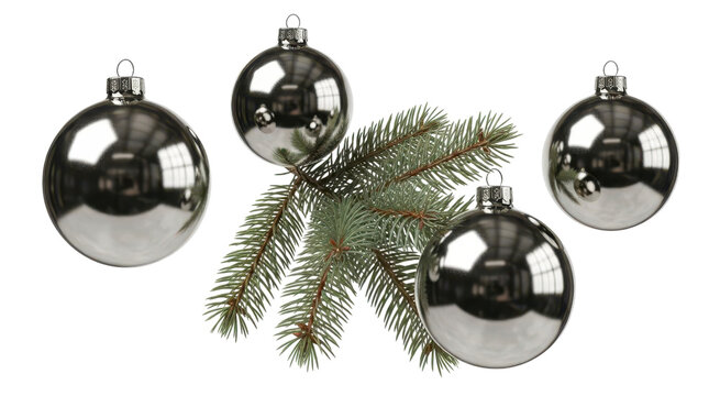 Festive ornaments and Green Pine Bough: A cluster of metallic silver baubles adorns a sprig of a vibrant evergreen, creating a minimalist yet celebratory holiday aesthetic.