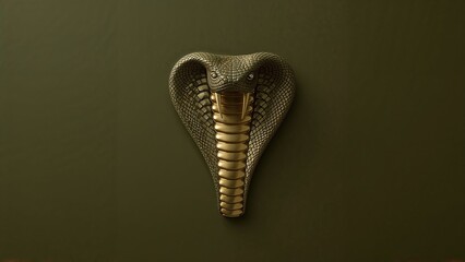 Metallic king cobra head sculpture against olive green background