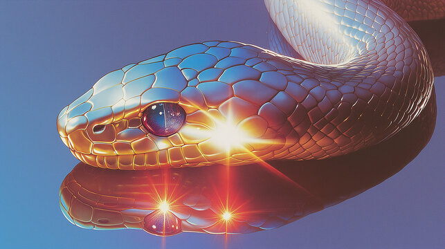 A modern and sleek digital illustration of a snake coiled in a spiral symbolizing cycles of life and regeneration with metallic green and silver accents